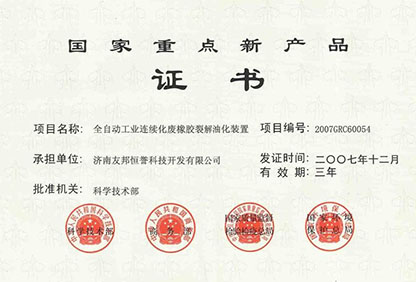 • 2007年12月,公司《全自动工业连续化废橡胶裂解油化装置》项目获国家重点新产品奖